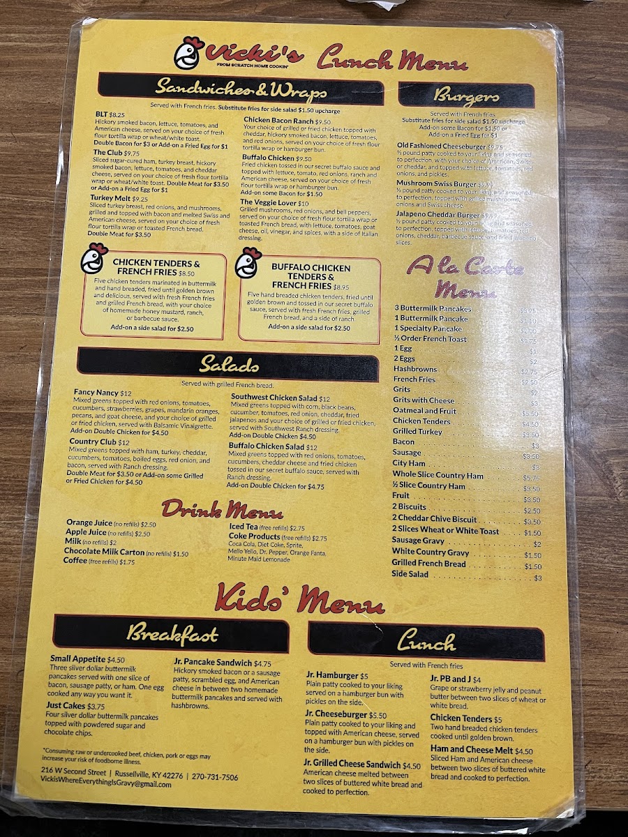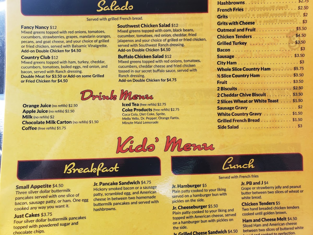 Country ham with choice of eggs: over easy to egg whites. Variety of sides spanning pancakes to biscuits, salads with varied dressings, or sweet options like banana bread.