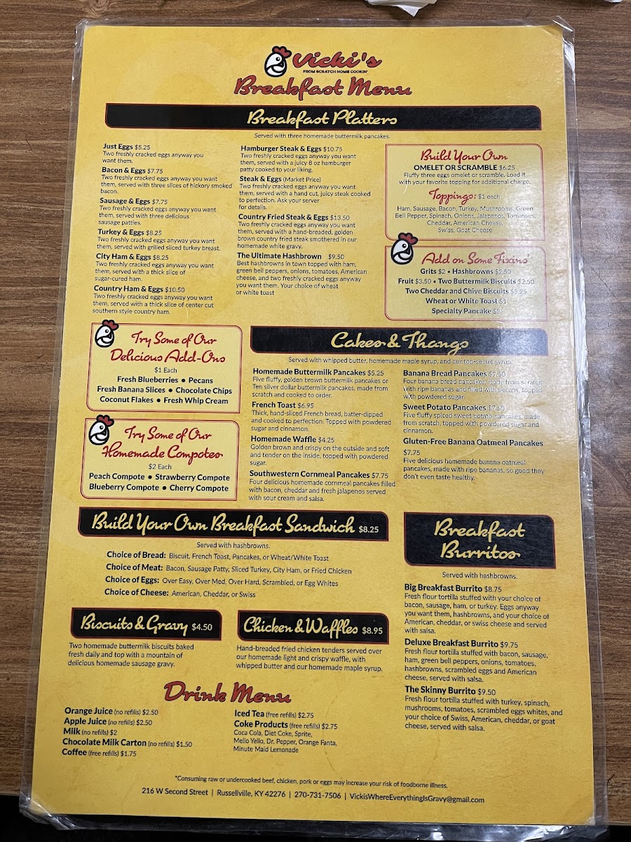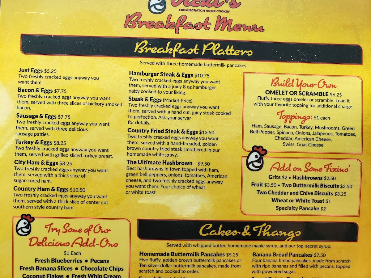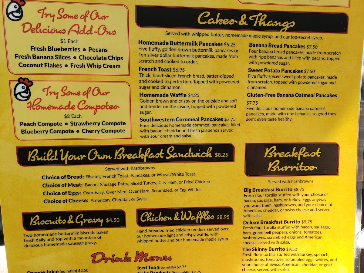 Golden hash browns with eggs your way: over easy to egg whites. Choose your toast: white, wheat, or biscuit. Wide selection of sides, from pancakes and fruit to various salads and sweet treats.