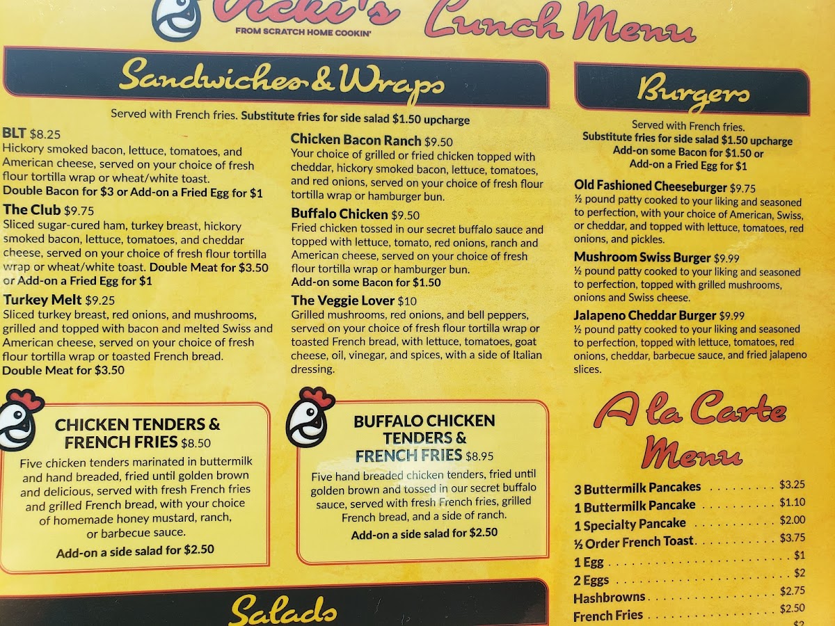 Chicken and bacon with ranch dressing on your choice of bun or wrap. Choose between fried or grilled chicken. Served with french fries or side salad.